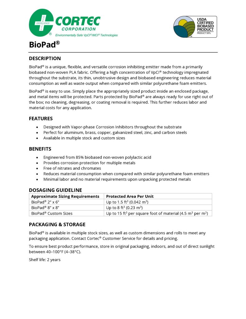 BioPad® 2” x 6” protects up to 1.5 cubic feet (42 L) per unit. BioPad® 8” x 8” protects up to 8 cubic feet (0.23 m3) per unit. BioPad® roll protects up to 15 ft3 per ft2 of material (4.5 m3/m2).